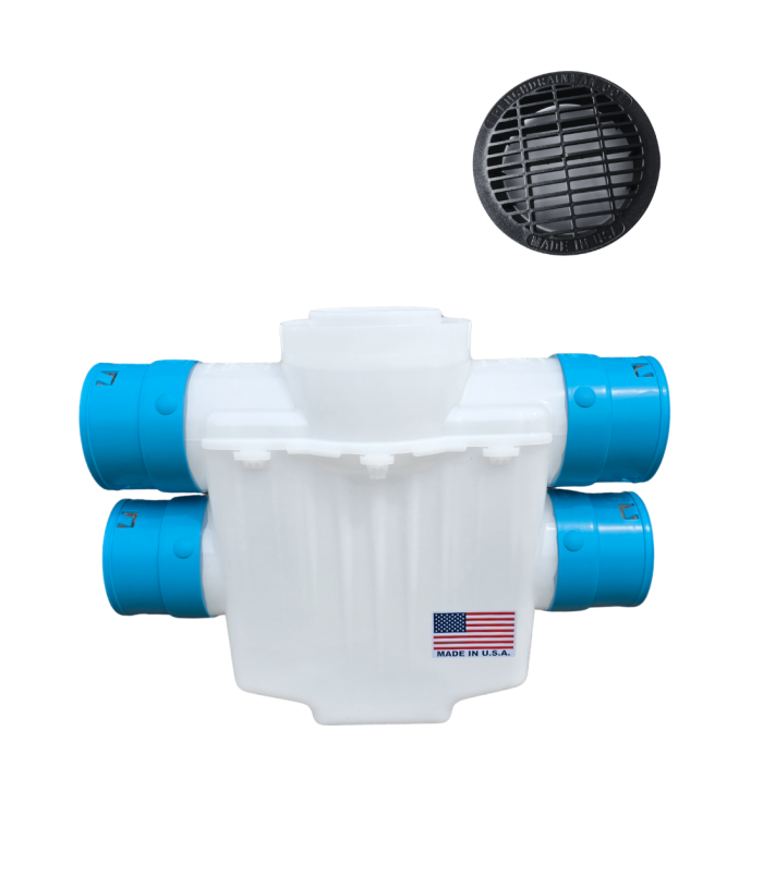 The bottom portion (sediment trap) is designed to take freeze ups without cracking or breaking, made from 100% virgin HDPE with no blown-in fillers or recycled materials for superior strength and longevity. It is also mold injected for controlled wall thickness, and connects to 4″ Corrugated.